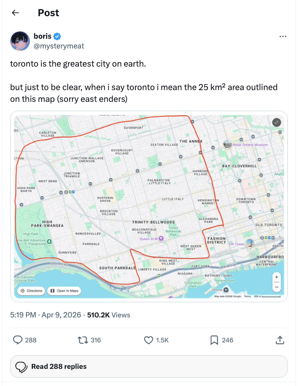 Ok this is hilarious. Someone (likely a subscriber of this very newsletter) claimed Toronto — or more specifically the West End of it (with the exclusion of Libery Village and King West) — to be the greatest city on Earth. I can’t help but agree, but you can imagine the Twitter beef this started.