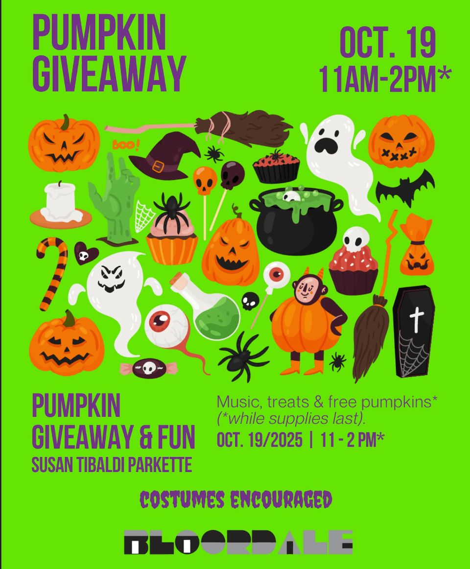 The Bloordale BIA are doing their annual pumpkin giveaway this weekend. Expect music, treats, and lots of candy. There will also be a costume contest so dress up to win prizes! Details